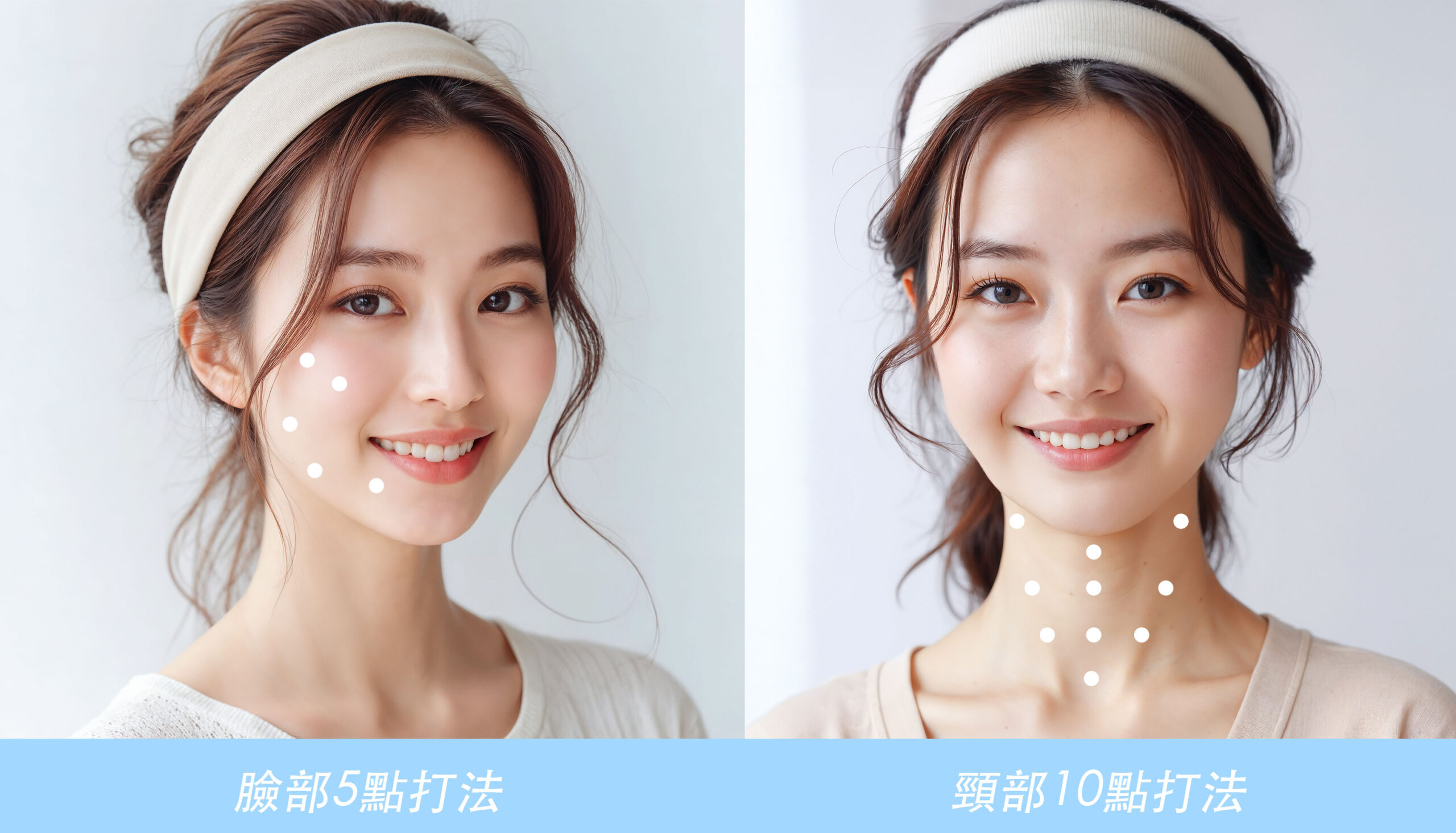 療程只須以臉部單邊5點;頸部10點進行注射,不會滿臉針孔,幾乎不留痕跡,可立即上班或恢復日常活動,仍須注意保持針孔處清潔衛生。